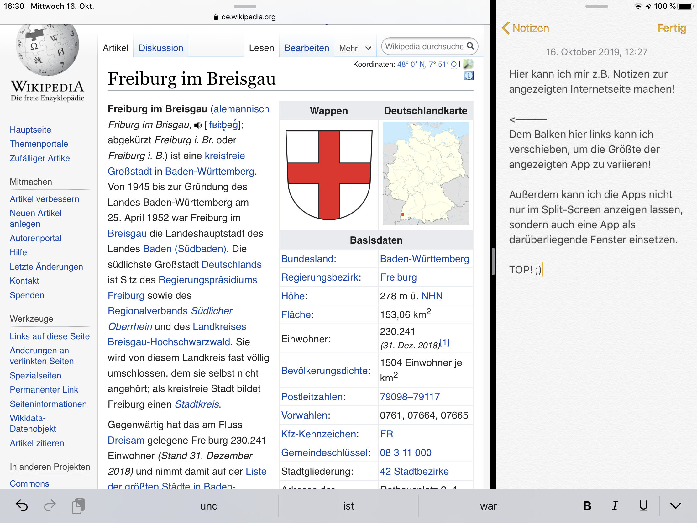 Multitasking beim iPad meint das gleichzeitige Arbeiten in verschiedenen Apps auf einem geteilten Display. Diese Funktion eignet sich sehr gut, wenn man nicht ständig zwischen Apps hin und her wechseln möchte, beispielsweise wenn man sich Notizen zu einer Internetseite machen oder während des Arbeitens in Video ansehen möchte. Außerdem hat man die Möglichkeit Dateien direkt von einer in die andere App zu ziehen (Drag & Drop), was beispielsweise den Dateiaustausch deutlich vereinfacht.
