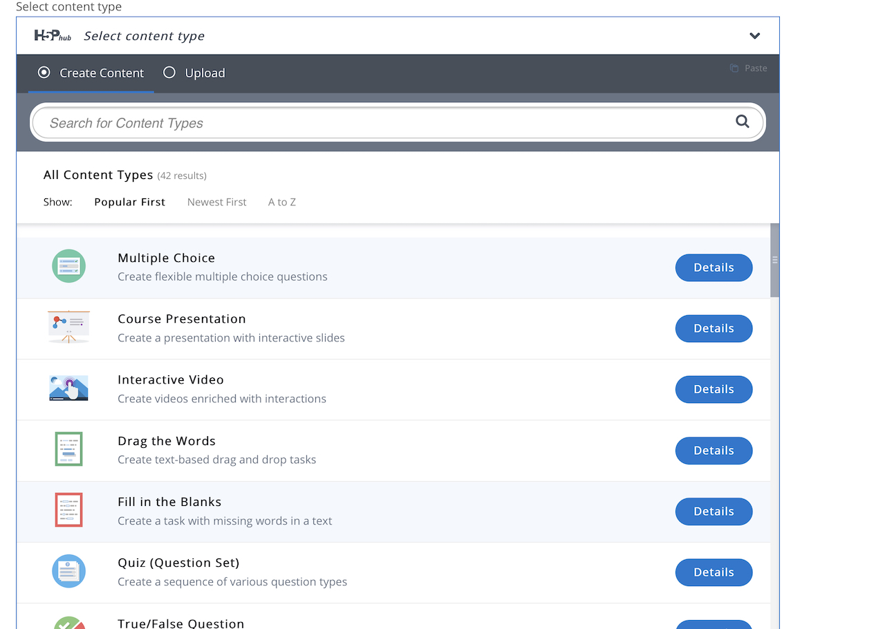 Leider sind bei den Homepage-Plugins für Wordpress, Moodle und Drupal nicht alle verfügbaren Inhalte vollständig auf Deutsch übersetzt. Bei der Nutzung über die Homepage www.h5p.org gibt es die Inhalte nur auf Englisch. (Stand Februar 2019)