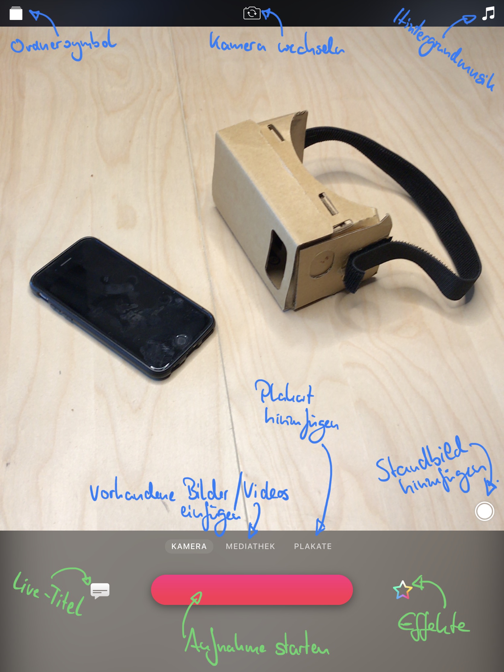 Tippen Sie auf „Kamera“ und stellen Sie wenn nötig die Rückkamera ein (Button ganz oben in der Mitte)