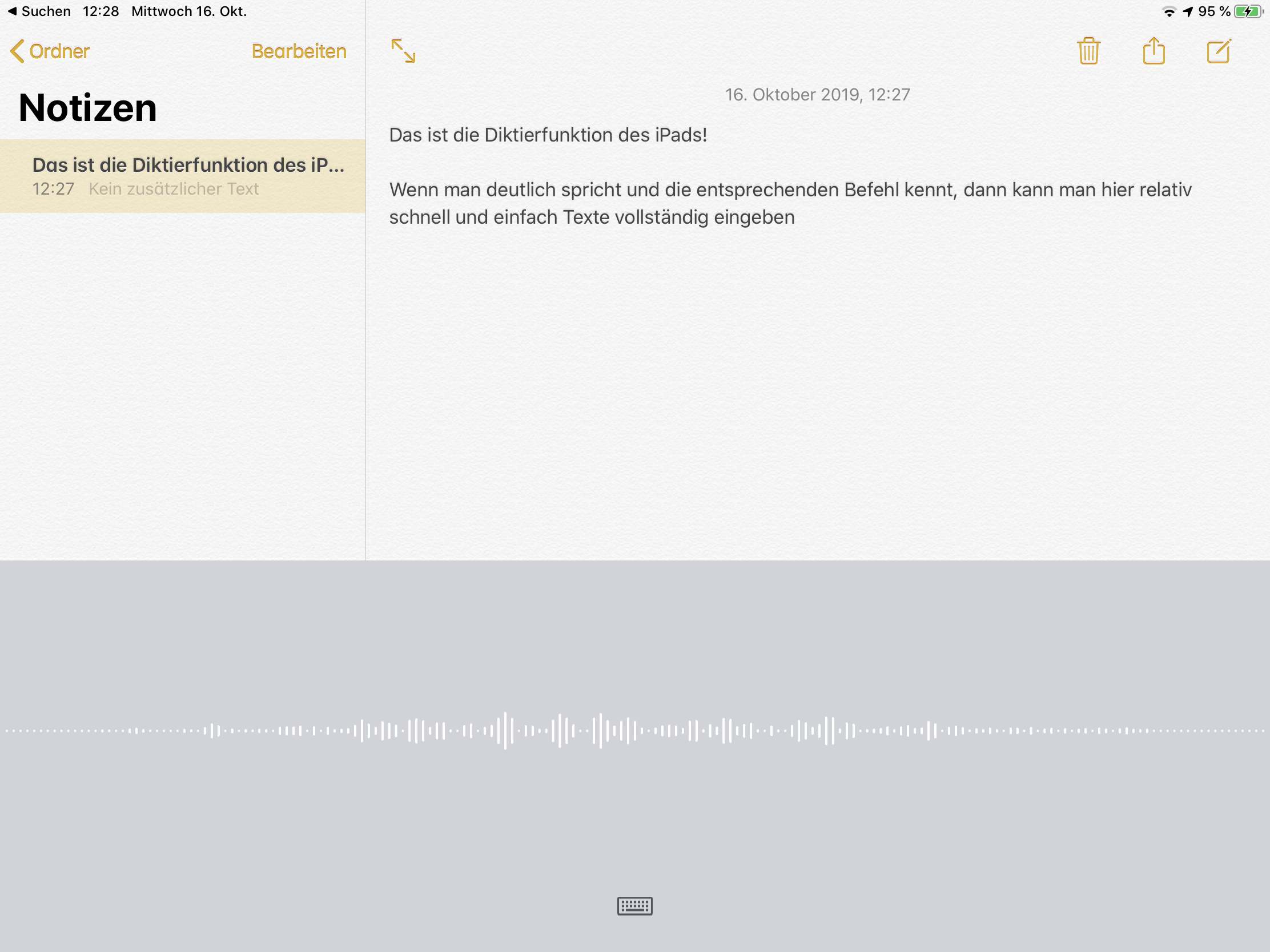 Über die Diktierfunktion des iPads kann man schnell und einfach Texte diktieren, die dann in Schrift umgewandelt werden. Solange man deutlich spricht, kann man auch bei hoher Geschwindigkeit erstaunlich fehlerfreie Text diktieren. Voraussetzung hierfür ist aber eine bestehende Internetverbindung des iPads. Die Diktierfunktion ist zudem komfortabel über die Standard-Bildschirmtastatur des iPads in allen Apps zu erreichen. Beachten Sie bitte die Datenschutzhinweise in den Einstellungen (>Allgemein>Tastatur> ganz unten).