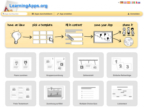 Die Webseite www.learningapps.org ist eine Web 2.0 Plattform, mit der man multimediale Lernbausteine („Apps“) selbst erstellen und verwalten kann. Hierfür stehen über 20 unterschiedliche Vorlagen („Templates“) wie beispielsweise „Paare zuordnen“ oder „Multiple Choice“ zur Verfügung. Darüber hinaus hat man Zugriff auf einen umfangreichen und nach Schulfächern sortierten Materialpool. Diese fertigen Apps kann man sehr einfach verändern und eine Kopie im eigenen Account speichern.