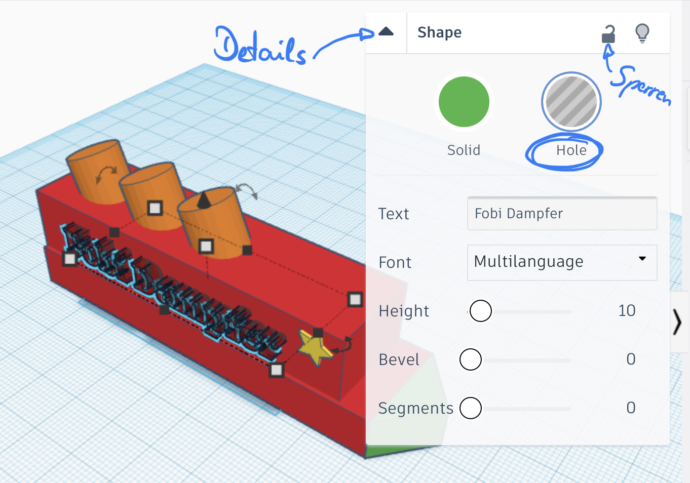 Wenn Sie eine bereits gesetzte Verzierung auf der Seite des Schiffs als „Loch“ in der Schiffsseite realisieren möchten, dann müssen Sie bei der Verzierung die Details des Objekts öffnen (kleines schwarzes Dreieck bei den Objektdetails - siehe Bild hier rechts) und dann auf „Hole“ tippen. Die Verzierung müssen Sie dann etwas in der Seitenwand des Schiffs versenken (einfach mit dem Finger antippen und verschieben). Als letzten Schritt müssen Sie dann noch die Verzierung und die Seitenwand gemeinsam auswählen (einfach beide Objekte nacheinander antippen) und dann auf den Knopf zum „Objekte kombinieren“ tippen (siehe Bild oben bei der Anleitung).