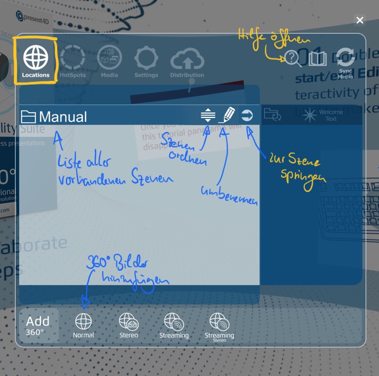 Die VR-Suite ist ein Autorensystem der Firma http://www.Present4D.com, mit dem man virtuelle und interaktive VR-Touren erstellen kann. Neben mehreren Szenen können auch 360°-Videos, Bilder und Tonaufnahmen eingebunden werden. Ab der Version 2.0 können auch Multiple-Choice Fragen direkt mit in die Tour eingebunden werden.